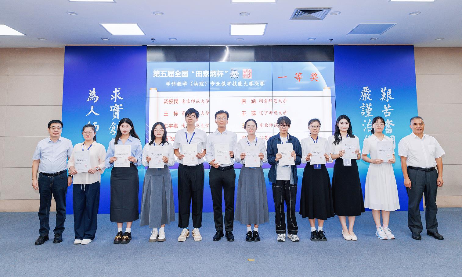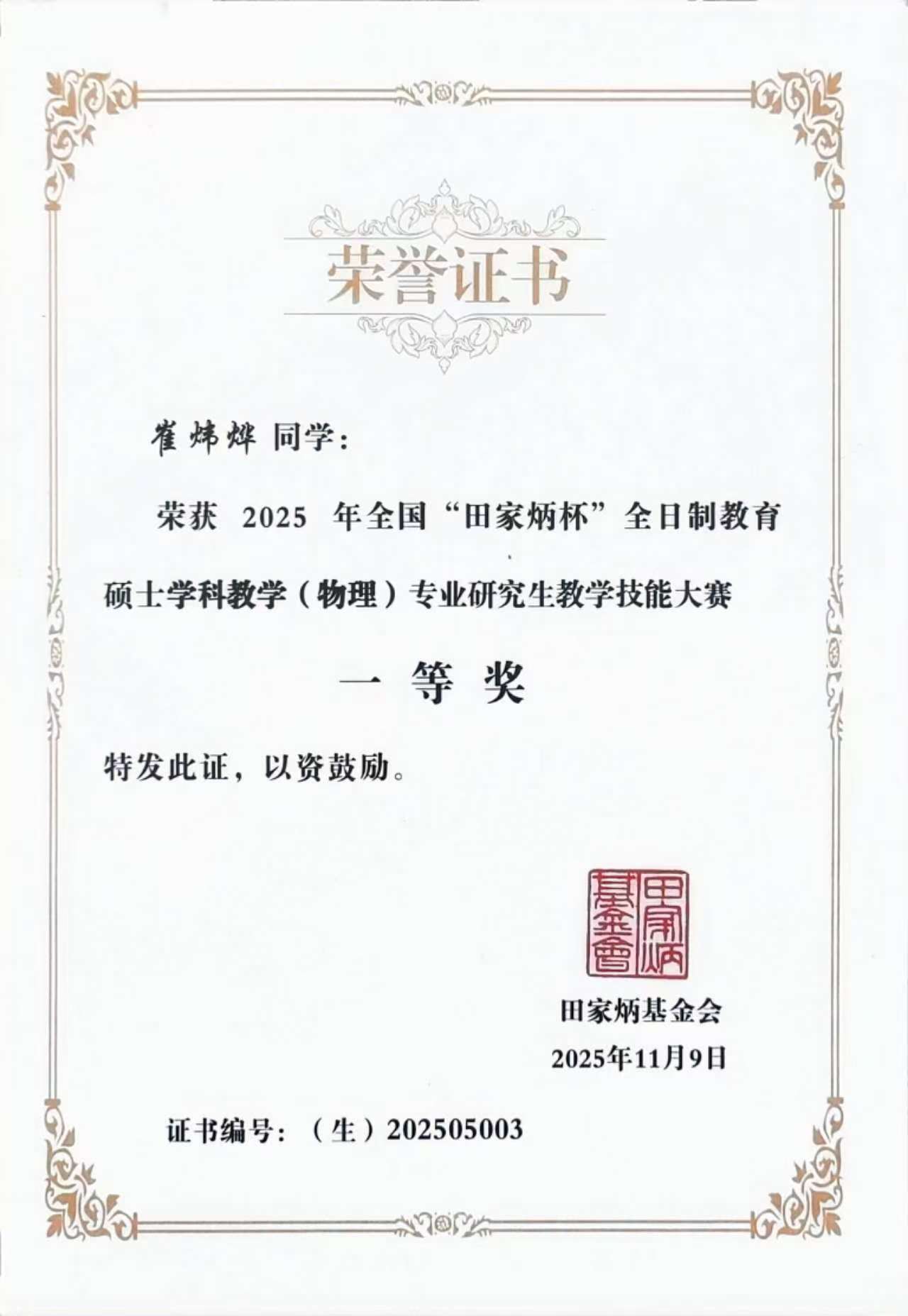 近日,2025年全国“田家炳杯”全日制教育硕士专业学位学科教学(物理)专业研究生教学技能大赛决赛暨全国学科教学(物理)专业研究生人才培养研讨会在华南师范大学圆满落下帷幕。我校2024级学科教学(物理)专业研究生崔炜烨在左桂鸿老师的带领下,凭借着扎实的专业功底、创新的教学设计和出色的临场表现,从众多优秀选手中脱颖而出,荣获大赛一等奖;郑友进老师荣获“优秀指导教师奖”。