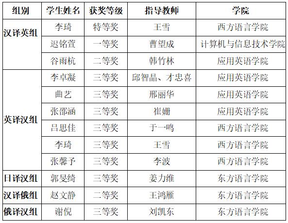 近日,第五届黑龙江省翻译大赛圆满落幕。我校应用英语学院、西方语言学院、东方语言学院、计算机与信息技术学院师生在大赛中表现优异,共斩获特等奖1项、一等奖1项、二等奖2项、三等奖8项,应用英语学院荣获“优秀组织奖”。